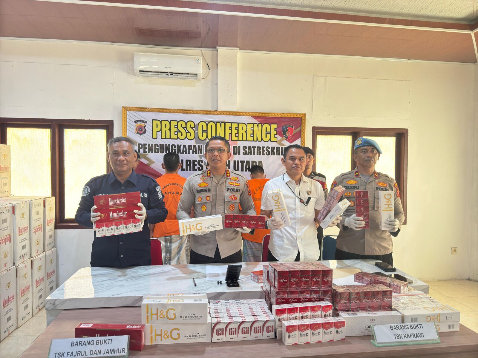 Lhoksukon – Netralpost.com | Polres Aceh Utara berhasil mengungkap kasus peredaran rokok ilegal tanpa peringatan kesehatan, dengan mengamankan tiga tersangka utama dalam operasi yang berlangsung di dua kecamatan berbeda di Aceh Utara. Hal ini disampaikan langsung oleh Kapolres Aceh Utara, AKBP Nanang Indra Bakti, S.H., S.I.K., didampingi Kasat Reskrim AKP Dr. Boestani, S.H., M.H., M.S.M., dalam konferensi pers di Mapolres Aceh Utara, Rabu (30/4/2025).